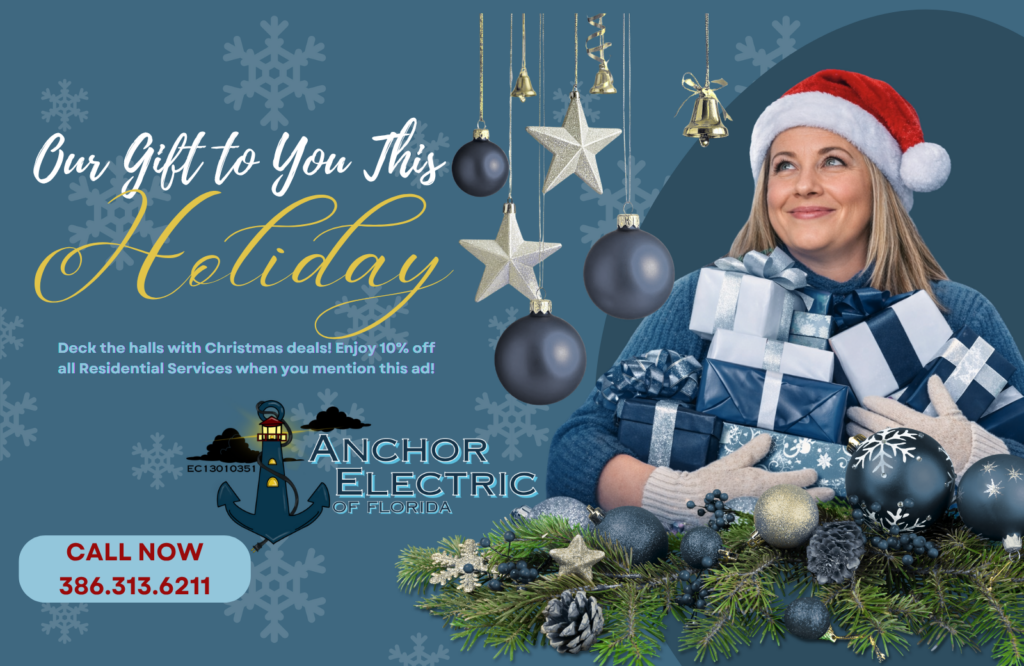 Get ready for the holiday season with our October Power Prep special! Anchor Electric of Florida is offering 10% off the installation of soffit and outdoor receptacles, perfect for safely powering your holiday lights, inflatables, and outdoor décor.
